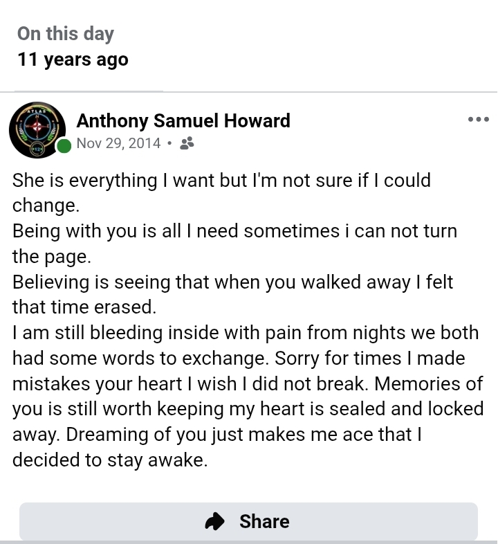 I'm Forever thinking of her...and ever sense the day we met, I still have eyes for this girl. On a few encounters before walking out my life; that last time we had...I still Love her till this day, and is most grateful to her for Saving me...after me, losing myself;...These days all i really want back in my life, is my Ex-Fiance..I may not know what words to say...but i know i would be Happy again.
